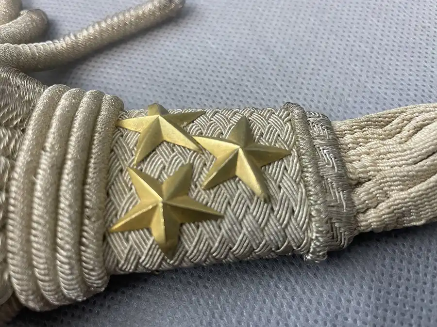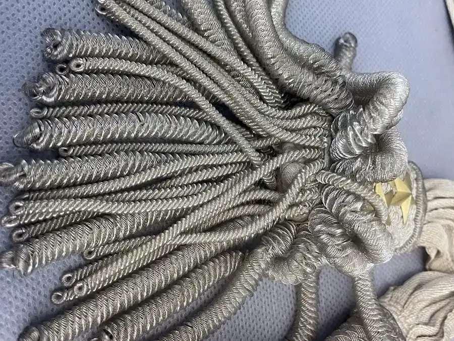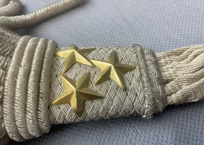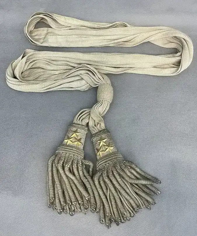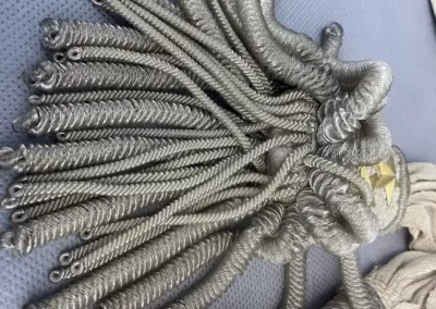 Aux extrémités sont cousus deux glands trapézoïdaux recouvert de cannetilles argent avec trois étoiles or de chaque coté.