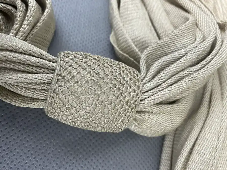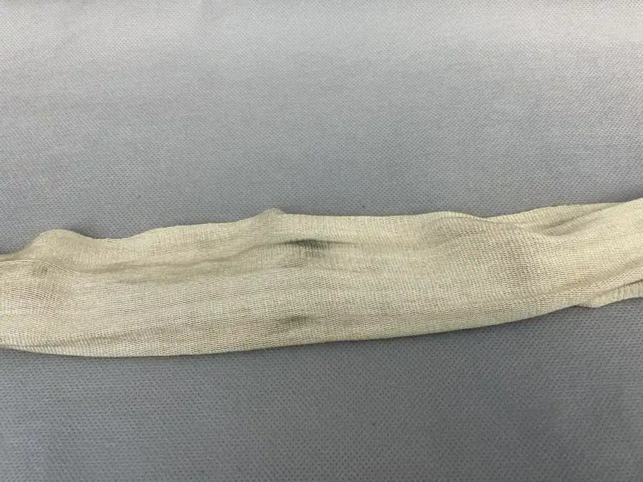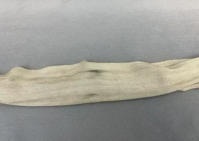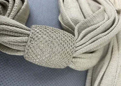 En mailles de soie blanche d’une longueur de 225cm et d’une largeur de 15 cm.